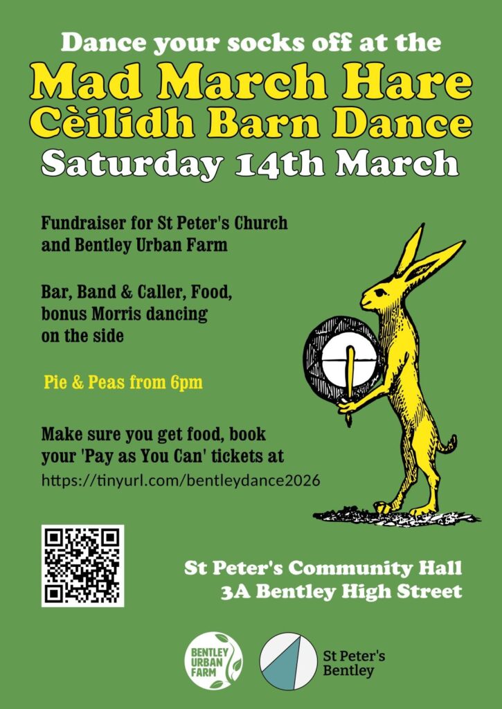 In the evening we’ll be having a fundraising cèilidh to raise money for Bentley Urban Farm and St Peter’s Church. Tickets for the event are being handled by St Peter’s, and we’ve got friends from Green Oak Morris joining us too. The church are doing pie & peas, we’re doing pudding and Charlie’s mate from london is coming up to do the calling, it’s co-co-collaborative! Book here to make sure you get food: